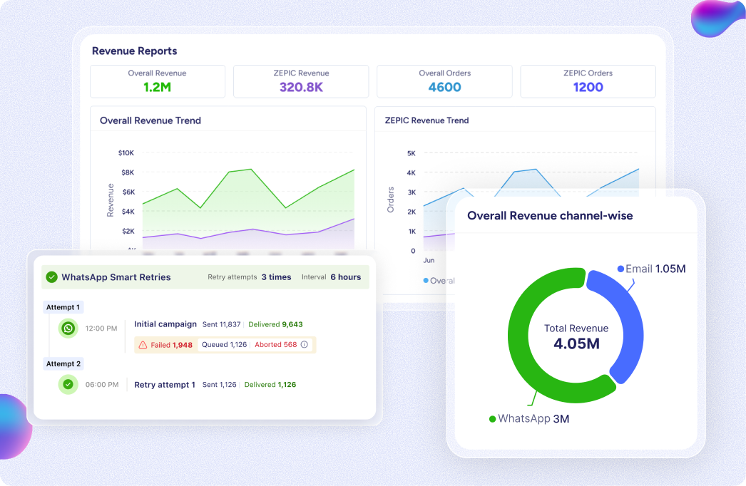 Revenue Attribution & Reports: Track which campaigns actually generate revenue by monitoring purchases up to 30 days after someone opens an email or reads a WhatsApp message. View revenue and orders directly in your ZEPIC dashboard and compare marketing-driven revenue against total revenue, so you know which channels and campaigns deserve your budgetânot just which ones get clicks.